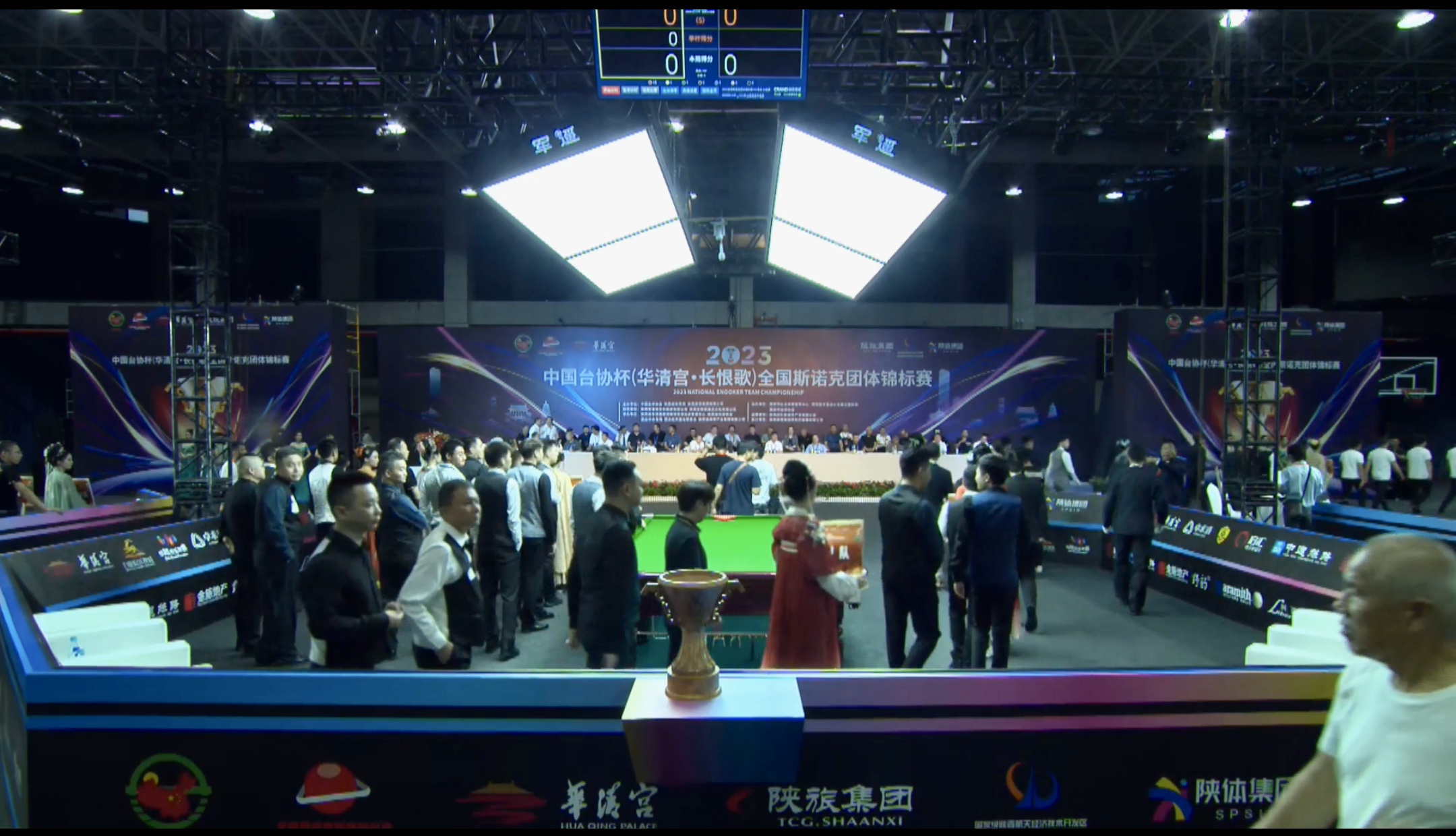 Team Shaanxi, represented by Fan Zhengyi, Lei Peifan and Mei Xiwen, is the defending Champion. They were in action in today’s evening session, on the main table. This evening session actually started with the official Opening Ceremony. All teams were introduced into the arena, guided by ladies in beautiful traditional dresses. As usual, there were speeches by officials and the presentation of the trophy, before the action started on the tables.