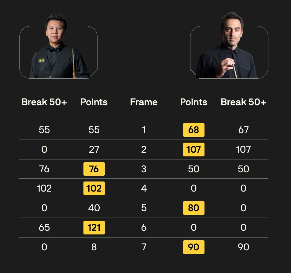 A marvellous 67 clearance gave O’Sullivan the opening frame today, then a 107 put him 2-0 ahead. China’s Zhou responded in kind as a 76 clearance gave him frame three, then a run of 102 made it 2-2. The fifth came down to the last red and Zhou failed to escape from a tricky snooker, handing his opponent the chance to go 3-2 ahead. Breaks of 65 and 56 got Zhou back to 3-3, but he missed a tricky red to a centre pocket early in the decider, and O’Sullivan was typically clinical in a match-winning 90.