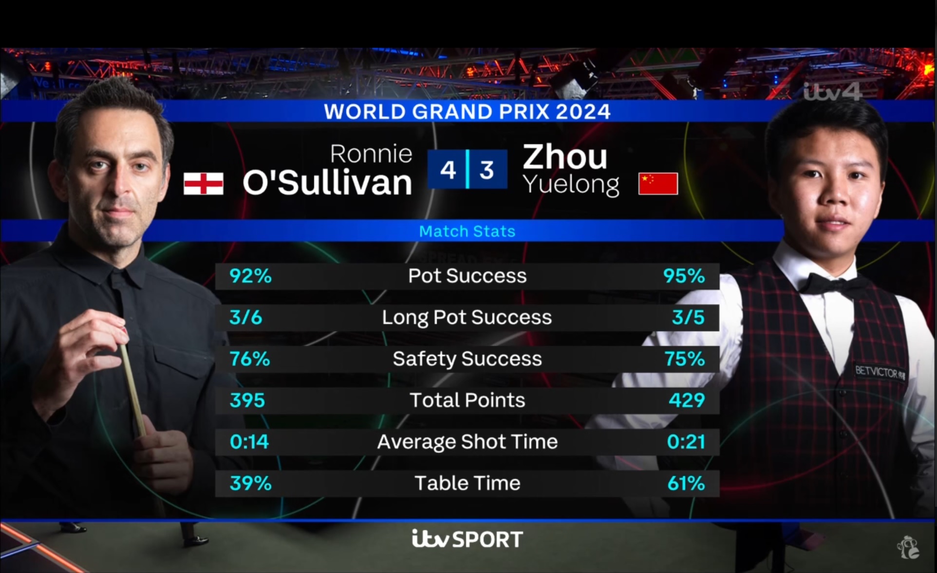 Ronnie beat Zhou Yuelong by 4-3 this afternoon to book his place in the quarter-finals at the 2024 World Grand Prix. He will lay Gary Wilson tomorrow over best of 9 frames.