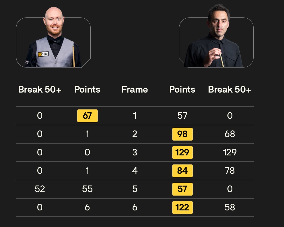 Frame five O’Sullivan has first chance and makes 34 before an unwanted flick off a red sends the cue ball in-off. Trump’s opportunity to respond ends when he misses a difficult thin cut on a red to corner, and O’Sullivan adds 27 which proves enough to get him on the scoreboard. O’Sullivan 1-4 Trump