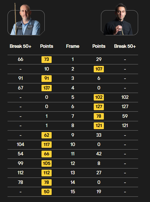 This match sets a new record for the combined age of the two players in a ranking final (97). O’Sullivan has won 33 of their 42 previous meetings, including 22 of the last 24. Surprisingly, they have not met in a ranking final since the 2000 China Open – indeed they contested three ranking finals that year, O’Sullivan winning two of them.