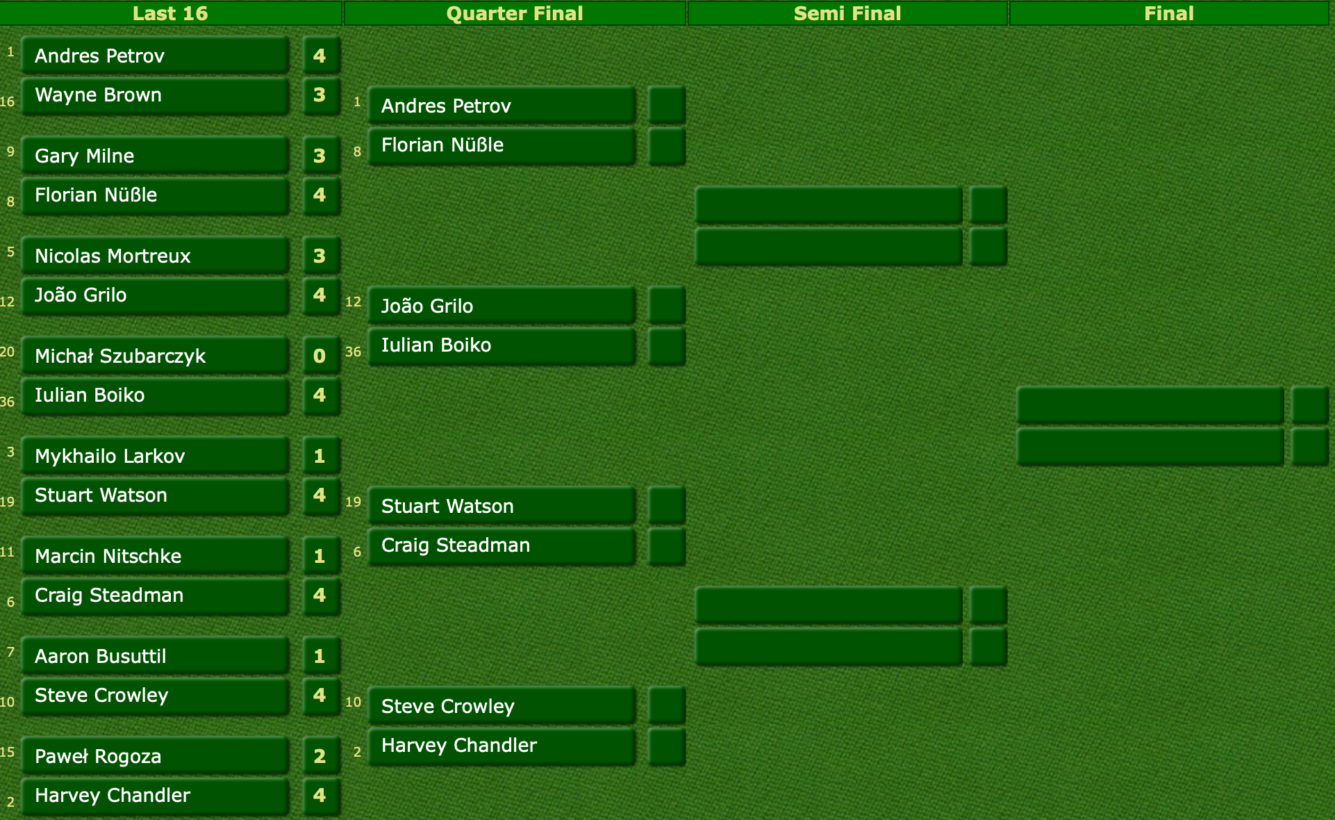 I have corrected a mistake in the report. The original text claims that the runner was a guy called Shane Mason. I don’t know where that came from but I watched the match and Florian’s opponent was definitely Stuart Watson, one of the very best Seniors players ↩︎