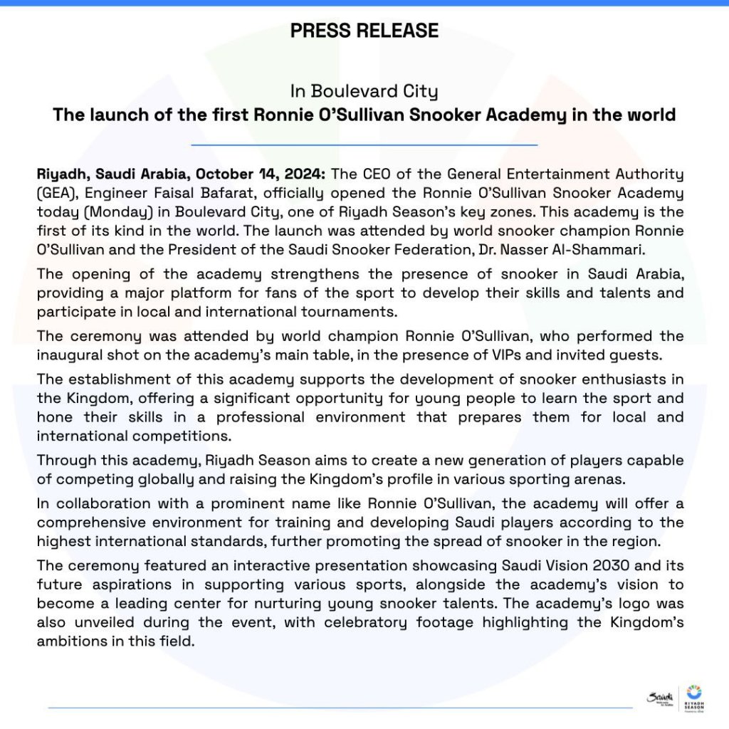 His Excellency Turki Alalshikh, Chairman of the General Entertainment Authority, said: “Snooker is an exciting part of our vision for Riyadh Season and that is why we are proud to partner with Ronnie O’Sullivan, one of the most successful ever in this sport. It will give all aspiring players in Saudi Arabia access to an elite facility to learn and develop under world-class, experienced coaches, as well as Ronnie, as we look to continue to build on the growing interest in snooker.”