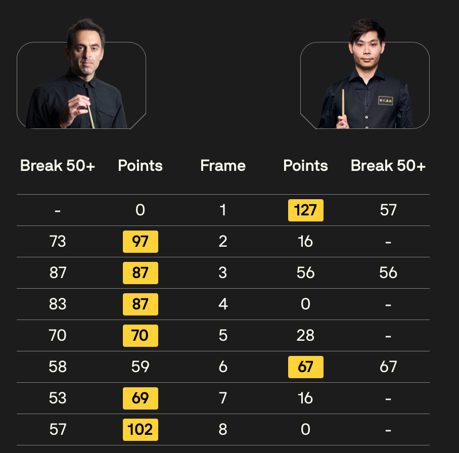 O’Sullivan said: “There are so many good Chinese players, who are technically very good and play amazing games. That was the third time I’ve played this guy and he beat me the first two times. For me, it was a big match and I had to just block out that I’d lost the previous two and try to play my game.”