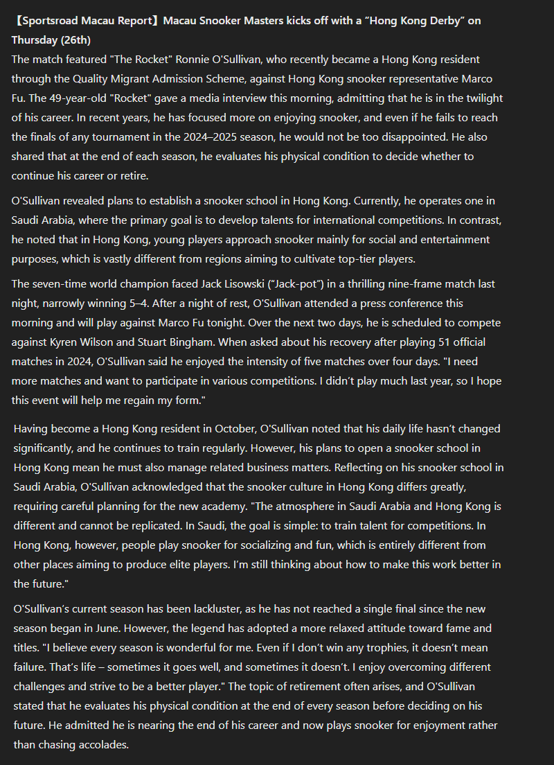 This year is the first that showed a clear decline in Ronnie’s game. The first half of the year was great. He won three titles in 20024: the 2024 Masters, the 2024 World Grand Prix and the 2024 World Masters of Snooker in Saudi Arabia. He also reached the final of the 2024 Tour Championship. All of those titles/finals came in the 2023/24 season. Since the start of this season he hasn’t won a title, actually he hasn’t reached a single final.