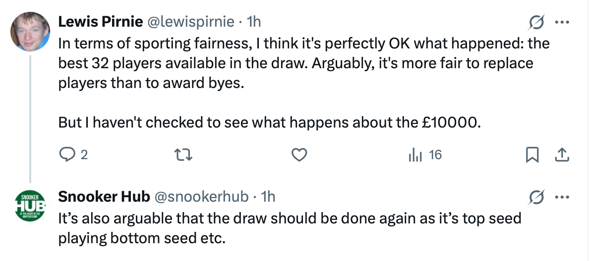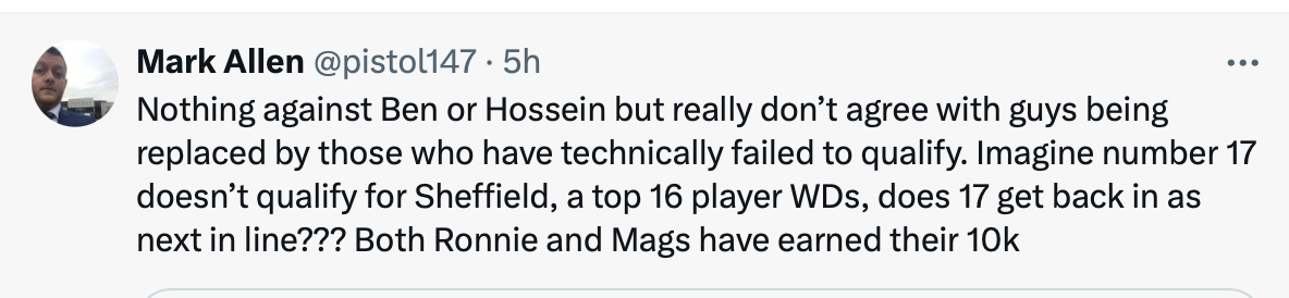 It’s definitely better for the fans and the promoters to have replacements. That said Mark Allen certainly has a point, and replacements don’t happen in the World Championship, even if it were to lead to an empty session. There is no consistency here. Snooker Hub also brings a valid point, but a redraw may bring a complete overhaul of the draw and schedule, leaving many spectators unhappy if they booked tickets to see specific players or matches. There is no straightforward answer to the issue.