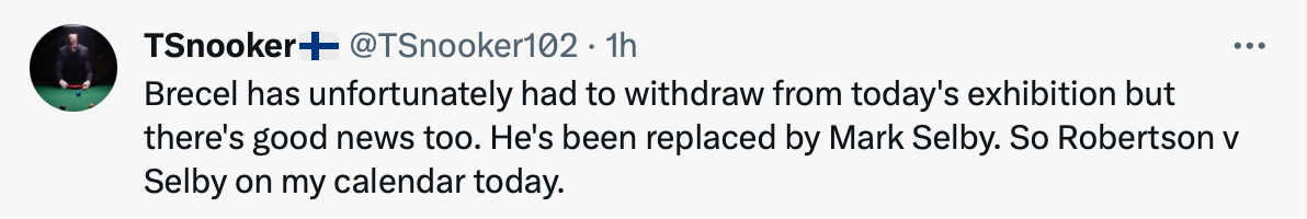 The Shoot Out is a ranking event. It is underway. Yet, Neil Robertson and Luca Brecel were supposed to play an exhibition in Finland today, and Mark Selby will now replace Brecel?